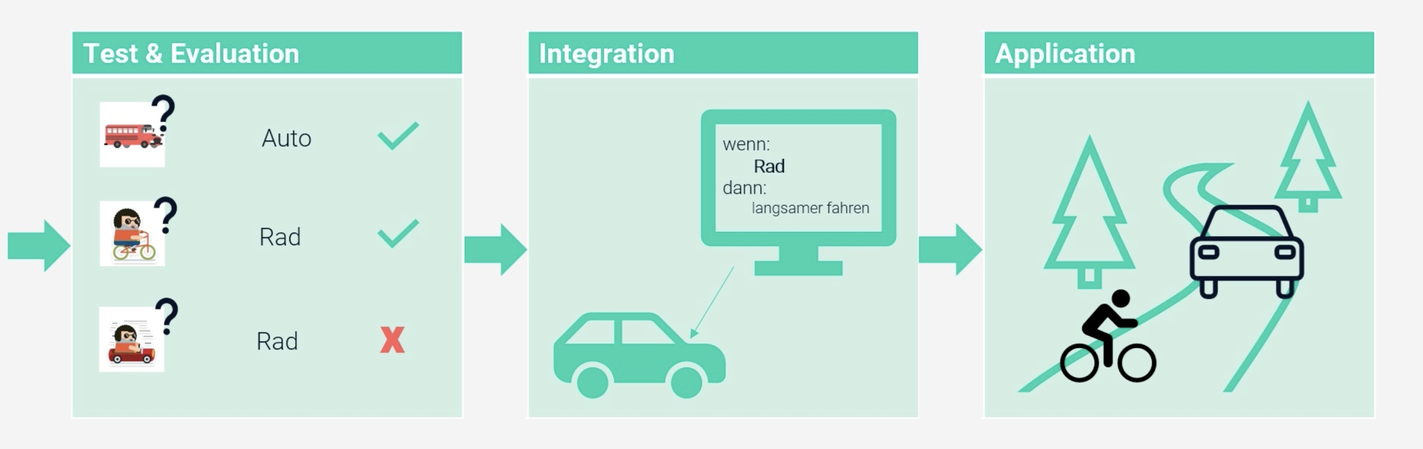 Sobald das Modell fertig trainiert ist, kann es im Rahmen anderer Programme eingesetzt werden. In unserem konkreten Beispiel wird das Modell zur Erkennung von Rädern in einem autonomen Fahrsystem verwendet. Erkennt das Modell ein Rad durch die im Auto verbaute Kamera, gibt es dem Auto das Signal, langsamer bzw. vorsichtiger zu fahren.