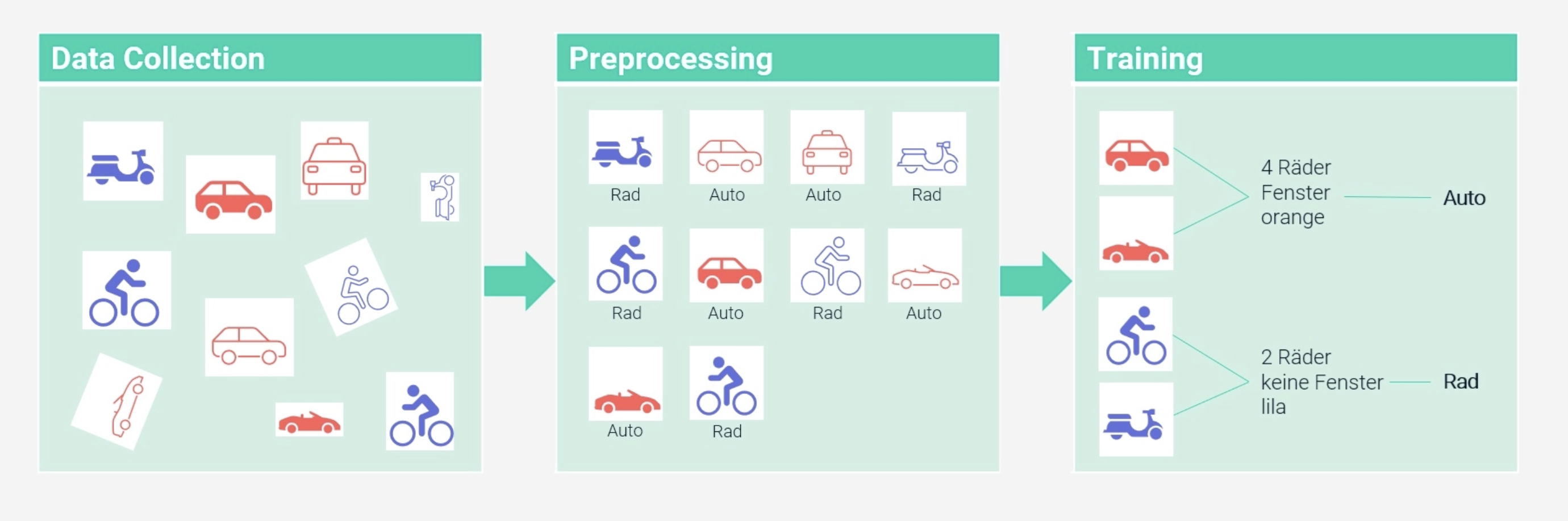 Nachdem die Daten gesammelt wurden, müssen sie für das Training aufbereitet werden – das nennt man Preprocessing. In diesem Schritt werden alle Daten in ein einheitliches Format gebracht. In unserem Beispiel bedeutet das, dass alle Bilder jetzt gleich groß und horizontal ausgerichtet sein sollten. Außerdem werden die Daten annotiert, also in Kategorien wie „Auto“ oder „Rad“ eingeordnet. Das Annotieren ist nur nötig, wenn diese Information nicht schon als immanenter Teil der Daten vorhanden ist.